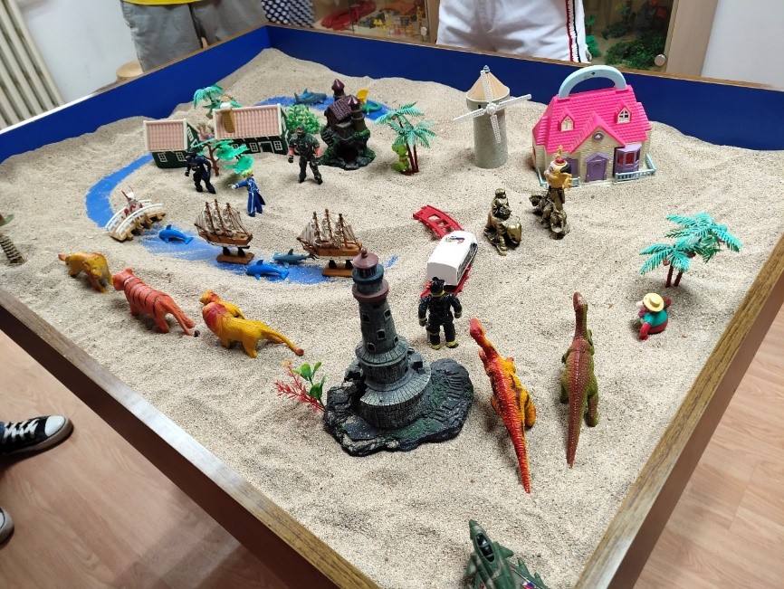 随后,大家依次分享自己挑选的6件玩具、摆放在这个位置的原因、别人摆放过程中自己的感受、最喜欢沙盘世界中的部分等等。郑老师在大家分享的过程中通过提问和交流引导大家认识自己潜在的内心世界,并为大家提出对待生活、对待自己的思考和意见:可能暂时无法理解的不和谐背后也有它存在的意义和动人的故事;试着走出去敞开心扉了解自己无意间忽略的外面的世界;试着去经历纷繁世界里的未知美好等等。活动结束之后大家互相交流彼此的感受,为沙盘世界起名字并合影留念。